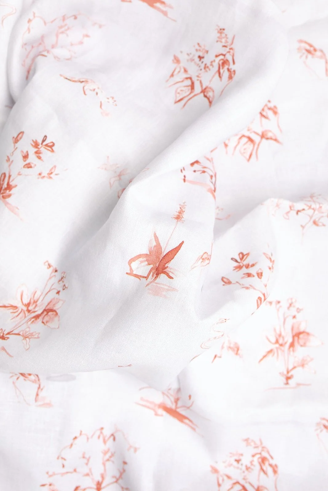 Garden Menagerie is a painterly take on the traditional Toile De Jouy pattern. In this whimsical garden delicate watercolor plants abound, while a menagerie of wild creatures explore the terrain. In this colorway, rich clay tones play on a watercolor gray.